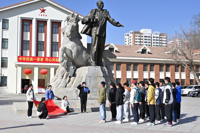 军垦博物馆前,王震将军雕像高高矗立,他是中国人民解放军的杰出将领之一。博物馆记录了众多兵团历史文物,真实再现了先烈屯垦戍边的伟大历程以及他们的勇气和智慧,通过解说员的讲解,同志们感慨颇深,纷纷表示今天的幸福生活来之不易。